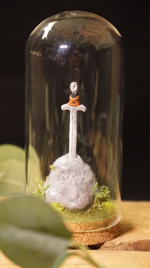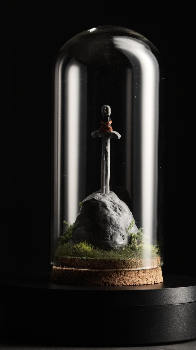 Plongez dans la légende avec ce diorama miniature représentant l’épée mythique plantée dans son rocher. Chaque élément est sculpté et peint à la main, puis mis en scène sous une cloche en verre pour préserver son mystère.